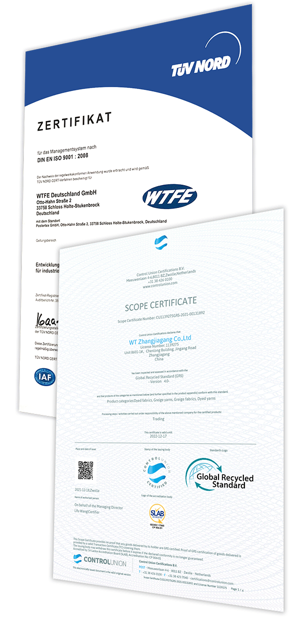 Unsere Standorte in Deutschland und China, sind "Global Recycled Standard" zertifiziert.